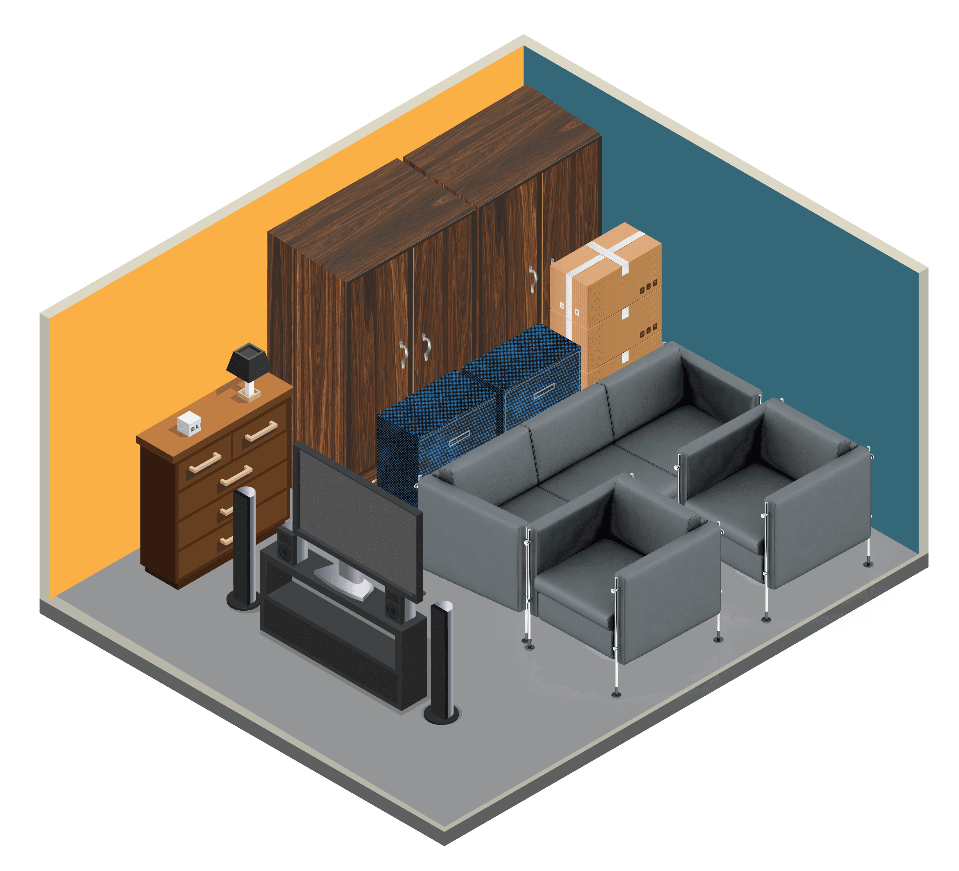 Holds the contents of a two-bedroom apartment, including furniture, boxes, and small appliances. It's ideal for storing larger furniture, electronics, or business inventory. Great for those with more extensive storage needs.